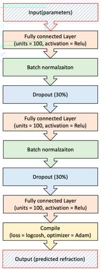 As first described by Arthur Samuel in 1959, ML is a “Field of study that gives computers the ability to learn without being explicitly programmed”. ML methods are also often used in the field of ophthalmology. There are numerous reports about image identification using NN, and we have conducted several reports on this area as well [24,25]. The prediction of postoperative refraction values is suitable for ML because it calculates the numerical value (postoperative refraction) using a set of numerical values obtained with preoperative measurements.