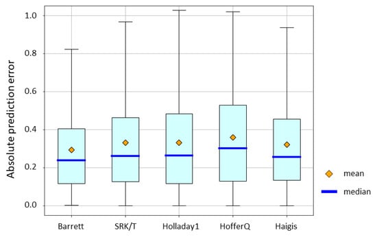 As the value predicted by the SRK/T formula was used as the explanatory variable, we compared absolute prediction error values provided by the SRK/T formula and ML methods (Figure 6). All ML methods yielded significantly lower absolute error values than did the SRK/T formula method.