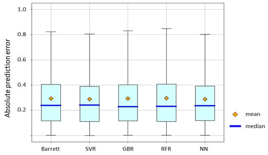 The absolute prediction error of the Barrett Universal II formula and ML methods is shown in Figure 4. Mean absolute error for the Barrett Universal II formula, SVR, GBR, RFR, and NN were 0.2960, 0.2877, 0.2929, 0.2964, and 0.2891, respectively. The p-value by the Friedman test was > 0.05. SVR and NN yielded lower absolute errors than the Barrett Universal II formula. RFR, GBR, and NN had lower median absolute errors than the Barrett Universal II. However, no significant difference in accuracy was observed among these groups.