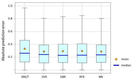 Mean absolute prediction error of the SRK/T formula and machine learning methods. Mean absolute error for the SRK/T formula, SVR, GBR, RFR, and NN were 0.3314, 0.2877, 0.2929, 0.2964, and 0.2891, respectively. The p-value by the Friedman test was < 0.0001. The SVR formula vs. the SRK/T formula: p < 0.0001; GBR vs. the SRK/T formula: p < 0.0001; RFR vs. the SRK/T formula: p = 0.0001; NN vs. the SRK/T formula: p < 0.0001; (The p-values were calculated using the Wilcoxon signed-rank test and were adjusted using the Bonferroni correction).