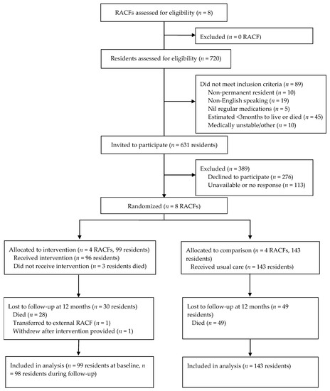 Participants were recruited between April and October 2017. All English-speaking residents taking at least one regular medication were eligible. Residents were excluded if RACF staff deemed they were medically unwell or were estimated to have less than three months to live. The 242 participating residents were similar to all residents of Australian RACFs in terms of age (62% vs. 59% aged 85 years or older), sex (74% vs. 67% female), and length of RACF stay (2.5 years vs. 2.9 years) [31].