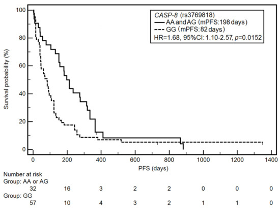 Figure 1. Kaplan–Meier curves illustrating progression-free survival (PFS) differences between genotypes AA and AG, GG of the CASP-8 gene (rs3769818).