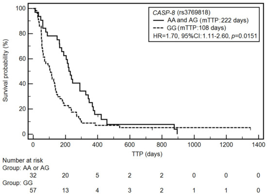 Figure 2. Kaplan–Meier curves illustrating time-to-progression (TTP) differences between genotypes AA and AG, GG of the CASP-8 gene (rs3769818).