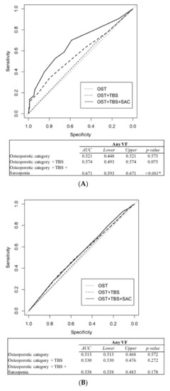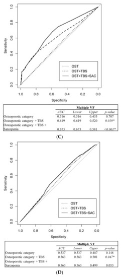 Area under curve (AUC) values for any vertebral fracture (VF) for (A) males and (B) females, and for multiple VFs for (C) males and (D) females. OST: osteoporotic category, TBS: trabecular bone score, SAC: sarcopenia. * Significant p-value.