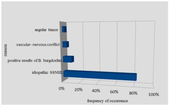 Reasons for sudden deafness in the examined group of patients (AT—two patients, VNC—four patients, PRBB—nine patients, ISSNHL—71 patients).