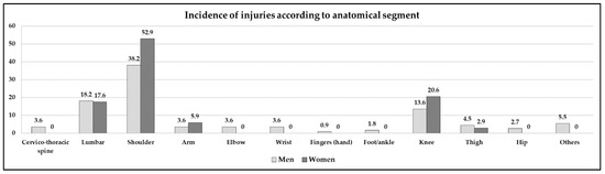 Regarding the distribution of the injuries in the different anatomical segments, the most frequent ones were shoulder injuries, followed by knee injuries (in females), lumbar injuries (in men) and injuries in the rest of the upper limb segments (Figure 1). The result of the chi-square test was not statistically significant for the anatomical distribution of the injuries according to gender. On the other hand, with respect to the time of occurrence of the reported injuries, the rate of injuries was significantly greater during training sessions than during competitions (x2 = 44.3; p < 0.001) for the entire sample (males: x2 = 27.3; p < 0.001) (females: x2 = 29.4; p < 0.001).