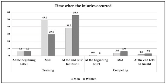 Figure 2 indicates that, in the males, the injuries occurred more frequently in the central period of the training sessions, whereas, for the females, the greatest frequency corresponded to the last 15 min of the training sessions.