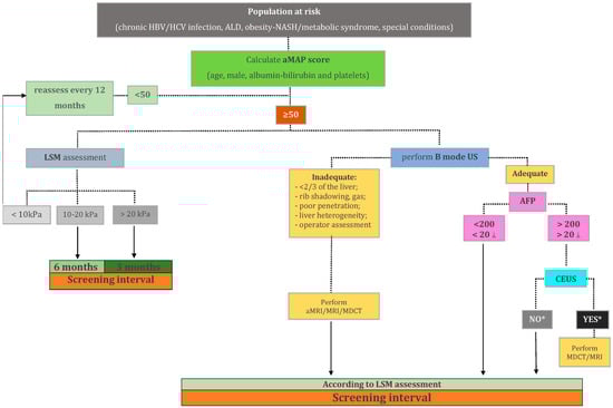 - Renzulli, M.; Golfieri, R.; Bologna Liver Oncology Group (BLOG). Proposal of a new diagnostic algorithm for hepatocellular carcinoma based on the Japanese guidelines but adapted to the Western world for patients under surveillance for chronic liver disease. J. Gastroenterol. Hepatol. 2015, 31, 69–80. [Google Scholar] [CrossRef]