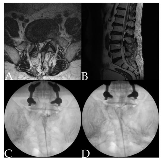 A 59-year-old man underwent L4–5 fusion surgery five years ago for excruciating pain from spinal stenosis. Afterward, the pain improved, and then bilteral leg pain began. He underwent adhesiolysis one year after the onset of symptoms. (A) Axial magnetic resonance image (MRI) showed the L5–S1 level with suspected adhesion around the central canal. (B) Sagittal MRI showed no specific abnormality at the L5–S1 level. (C) Epidurogram confirmed filling defect at the central canal of the L5–S1 level. (D) Contrast flow was observed at the L5 vertebra body level after mechanical adhesiolysis with catheter.