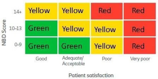 After completing all three components of the MENTOR tool, patients were assigned to one of three zones; a green, a yellow, or a red zone. As illustrated in Figure 1, the combination of an NBD score and patient satisfaction allocates the patients to one of the three zones in the MENTOR grid. Further, if an individual reports any of the listed SAS they will be moved one grid square up and to the right, effectually escalating their treatment recommendation. The green zone represents adequate treatment of individuals, the yellow zone reflects suboptimal treatment and a need of further discussions with the individual and the possibility of change in treatment and/or further monitoring and the red zone suggests inadequate treatment and a need for further examination and most likely, change in current treatment.