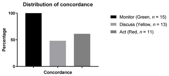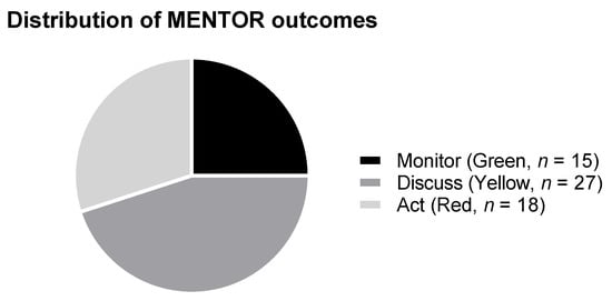 Distribution of MENTOR outcome in Hyogo Prefectural Central Rehabilitation Hospital (n = 60). Green “Monitor”, Yellow “Discuss,” and Red “Act”.