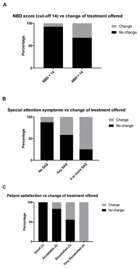 (A) Severe neurogenic bowel dysfunction (NBD) score associates with treatment change. (B) Linear association of special attention symptoms (SAS) and treatment change. (C) Inverse association between patient satisfaction and treatment change.