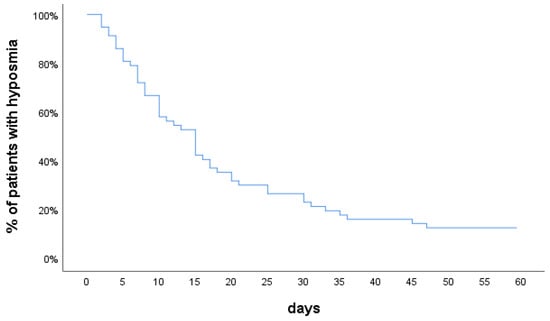 The majority of our patients had severe loss of smell/anosmia, at onset (74%), in agreement with the findings reported in other studies [,]. Our patients’ groups with varying chemosensory loss severity showed no statistically significant differences in recovery rates. Vaira et al. also reported no significant difference in the persistence of impairment between patients with varying olfactory loss severity at baseline evaluation of their cohort []. However, regarding the time to recovery in those who recovered their sense of smell, in our study, patients with moderate olfactory loss had a quicker recovery compared to patients with more severe impairment. This is in agreement with findings reported by Lechien et al., who found that a less severe loss of smell was significantly associated with an earlier recovery []. In our study, the calculated mean duration of smell loss recovery was smaller for extremely severe than for severe loss; however, our anosmic patients did not have a quicker recovery overall. The days to recovery have been calculated and compared only for the patients who recovered their sense of smell by 61 days. Whereas all patients with severe hyposmia (100%) had recovered their sense of smell by 61 days, a percentage of anosmic patients had not recovered. Therefore, the percentage of anosmic patients who had not recovered by 61 days from smell loss onset and had olfactory impairment for longer than 61 days are not included in this comparison. Regarding individual patients results, it took four patients (out of 11) 33, 35, 36, and 45 days to recover olfaction in the severe loss subgroup and four patients (out of 27) 30, 30, 31, and 47 days in the anosmia subgroup. The main difference between these subgroups is the patients that had not recovered by 61 days. Larger studies on patients with all levels of disease severity will be needed to determine whether there are predisposing factors for developing long-lasting chemosensory disorders.
