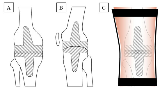 The novel inverse spacer was intraoperatively molded with PMMA bone cement containing antibiotics adapted to the antibiogram of the respective microorganism according to the supplier’s instructions (Heraeus Medical, Wehrheim, Germany; mostly pre-fabricated gentamicin and/or clindamycin palacos—both 1 g/40 g of palacos—or, alternatively, self-prepared vancomycin palacos—≤4 g/40 g palacos—). For this purpose, first the tibial spacer component was pre-formed in the surgeon’s hand, implanted, and formed in a convex manner with a spatulum. Thereafter, the femoral spacer component was pre-formed, implanted, and intra-articularly molded with a spatulum to adapt its concavity as closely and congruently as possible to the convex tibial component without specific adaptation to the retropatellar surface (for details of the joint position see below). Comparable amounts of PMMA bone cement were utilized for the two different spacer components.