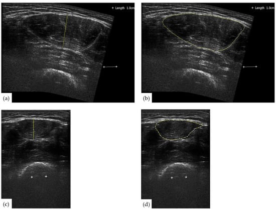 Examples of rectus femoris muscle thickness and CSA captured via ultrasonography for one participant. (a) Rectus femoris muscle thickness at 50% of leg length captured using the panoramic feature. (b) Same as A but showing muscle CSA. (c) Rectus femoris muscle thickness at 75% of leg length captured using a standardized B-mode image. (d) Same as C but showing muscle CSA.