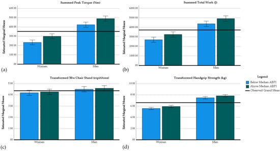 Our mixed models explained 78.6% of the variance of summed peak torque performed during the isokinetic strength test, 75.7% of the variance of summed work performed during the isokinetic endurance test, and 83.3% of the variance in handgrip strength transformed using the square root function, indicating good model fit for these performance variables. However, our mixed model investigating the results of the 30-s chair stand test only explained 19.1% of the variance in this measure, indicating relatively poor model fit. Nonetheless, all models were significant.