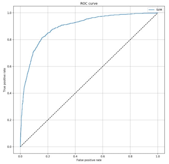 ROC curve of the Support Vector Machines (SVM) algorithm to predict 7-day mortality. This curve shows the predictive performance of the SVM algorithm including SAPS II, sex, patient’s origin, type of ICU admission, non-surgical treatment for acute coronary disease, surgical intervention, presence of invasive devices at ICU admission, trauma, impaired immunity, antibiotic therapy in 48 h before or after ICU admission. The parameters applied to the SVM algorithm were C = 2 and = 0.3.