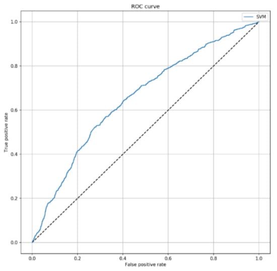 ROC curve of SVM algorithm predicting 7-day mortality, by excluding SAPS II score. This curve shows the predictive performance of the SVM algorithm including sex, patient’s origin, type of ICU admission, non-surgical treatment for acute coronary disease, surgical intervention, presence of invasive devices at ICU admission, trauma, impaired immunity, antibiotic therapy in 48 h before or after ICU admission. The parameters applied to the SVM algorithm were C = 2 and = 0.1.