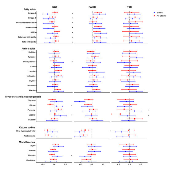 Statin usage affected the association between PCSK9 and lipid metabolism variables in subjects with normal glucose tolerance with more negative associations between PCSK9 and LDL-C, intermediate-density lipoprotein cholesterol (IDL-C), VLDL-C and total cholesterol levels (NGT; Figure 2). LDL and IDL triglycerides, small LDL, medium LDL, large LDL, IDL and very small VLDL particle concentrations followed a similar trend. Similar observations were made with LDL particle size, apolipoproteins and fatty acids as well as lactate, while there were more positive associations for phenylalanine, citrate, lactate and albumin with the statin medication (Figure 3). In subjects with impaired glucose metabolism and T2D, statin usage had no significant effects on the associations between PCSK9 and metabolomics parameters, with very few exceptions (VLDL particle size, pyruvate and lactate).