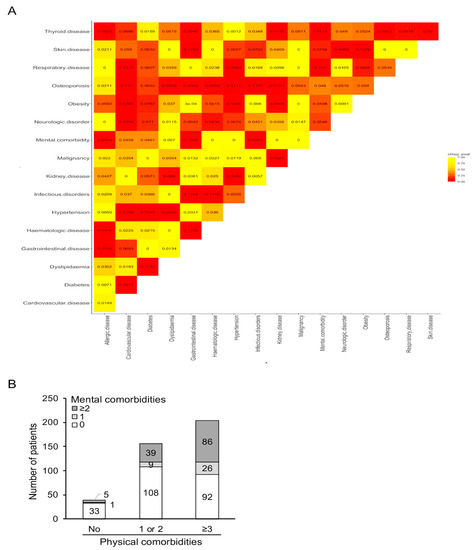 Co-segregation of comorbidities in patients with SLE at the community-based registry of Crete. (A) Correlation matrix of various comorbidities from diverse organs and domains. Numbers inside each box represents the Cramer’s V statistic estimated for each pair of comorbidities with values > 0.10 signifying robust correlation. Color intensity corresponds to the chi-squared p-value for each pairwise association. (B) SLE patients were categorized according to the number of physical (none, 1 or 2, ≥3) and mental (none, 1, ≥2) comorbidities as described in the main text. Y axis shows the number of patients with various combinations of physical and mental comorbid disorders.