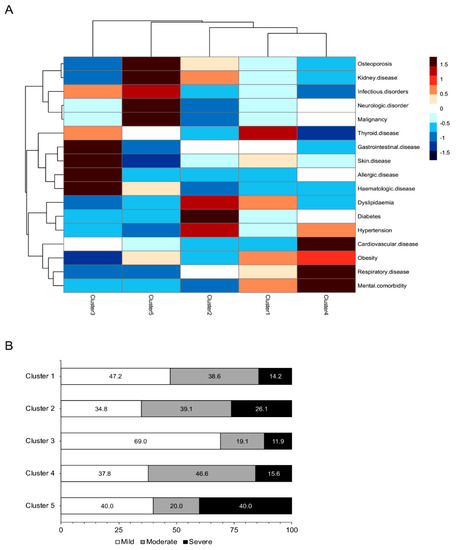 Distinct comorbidities phenotypes in patients with SLE revealed by cluster analysis. (A) Utilizing Gower’s distance and complete linkage method, hierarchical agglomerative clustering of the patients according to their comorbidity profile was performed. The chi-squared statistic was used to examine whether the distribution of the comorbidities differed between the identified patient clusters. The heatmap of the frequencies of comorbidities groups across the patient clusters is shown. Legend depicts the relative frequency (ranging from −1.5 to +1.5) of each comorbidity within each cluster. (B) Prevalence of SLE severity patterns (mild, moderate, severe) based on the BILAG system across the identified comorbidities clusters (cluster 1 to 5). Numbers are proportions (%).