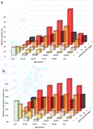 The following are available online at https://www.mdpi.com/2077-0383/10/6/1168/s1, Figure S1: Distribution of classes of proteinuria by age groups. Figure S2: Distribution of the CKD-EPI equation stages by age groups. Table S1: Proportion of CKD-stage changes according to eGFR estimation formula by age category.