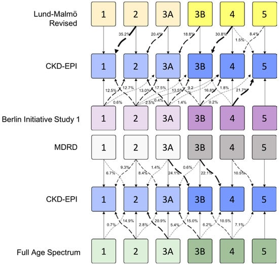 Percentage of patients changing CKD stage based on comparisons of the results from other formulae with CKD-EPI. Curved arrows show the percentage of cases that changed classification according to the formula used. Straight arrows indicate the remaining cases that did not change stage.