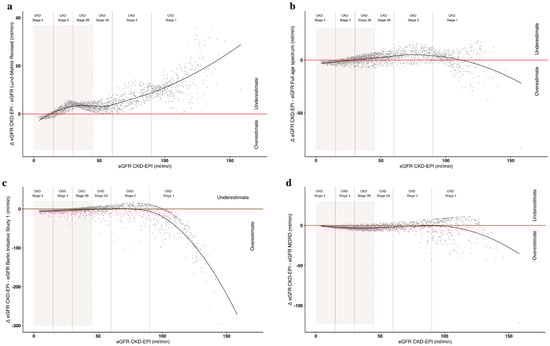 Estimated glomerular filtration rate (eGFR) overestimation or underestimation according to different formulae compared to CKD-EPI in our cohort: (a) Lund–Malmö Revised; (b) Full Age Spectrum; (c) Berlin Initiative Study 1; and (d) modification of diet in renal disease (MDRD). The grey background identifies a glomerular filtration rate ≤ 45 mL/min.