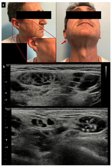 Examples of clinical parotid swelling (a) and appearance of mucosa–associated lymphoid tissue (MALT) lymphoma by ultrasound (b). Red arrow: Parotid swelling visible after cutaneous inspection.