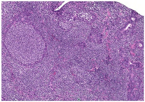 Recently, Zabotti et al., evaluated the diagnostic accuracy and safety of US-guided CNB in pSS patients, comparing the technique with open surgical biopsy []. The Authors selected a prospective case cohort of thirteen patients with pSS and clinically persistent (≥2 months) SG enlargement (nine parotid and three submandibular), who underwent US-guided CNB, confronting data with a retrospective control cohort of 13 patients who underwent parotidean open surgical biopsy. Importantly, it was specified that at least one of the US-guided CNBs was targeted at the most sonographically suspicious lesion, when present, or on the clinically most swollen gland. In all cases, the tissue samples were sufficient and adequate, permitting histopathological diagnosis, and immunohistochemical and molecular analysis. These evaluations allowed for a definite diagnosis in all the cases, and the complete characterization of a possible lymphoproliferative disease (Figure 2).