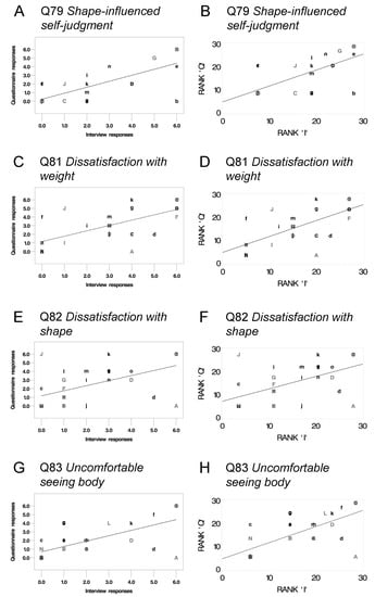 The four ordinal items (see Section 3.2) were significantly correlated between formats (p < 0.05, Figure 2A–H) even with Bonferroni correction (k = 4, α = 0.0125). These items addressed feelings of dissatisfaction with shape and weight, self-judgment, and being uncomfortable with seeing your body. Neither of the slopes were significantly different from 1, nor were the intercepts significantly different from zero.