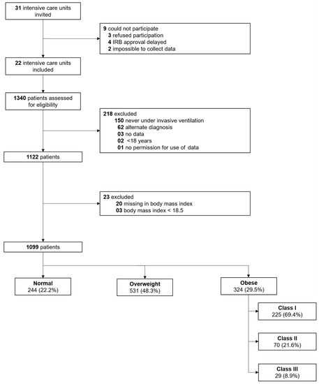 - O’Brien, J.M., Jr.; Welsh, C.H.; Fish, R.H.; Ancukiewicz, M.; Kramer, A.M. Excess body weight is not independently associated with outcome in mechanically ventilated patients with acute lung injury. Ann. Intern. Med. 2004, 140, 338–345. [Google Scholar] [CrossRef]