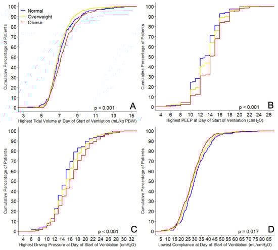 - Kalra, S.S.; Siuba, M.; Panitchote, A.; Mireles-Cabodevila, E.; Chatburn, R.L.; Krishnan, S.; Duggal, A. Higher Class of Obesity Is Associated With Delivery of Higher Tidal Volumes in Subjects With ARDS. Respir. Care 2020, 65, 1519–1526. [Google Scholar] [CrossRef]