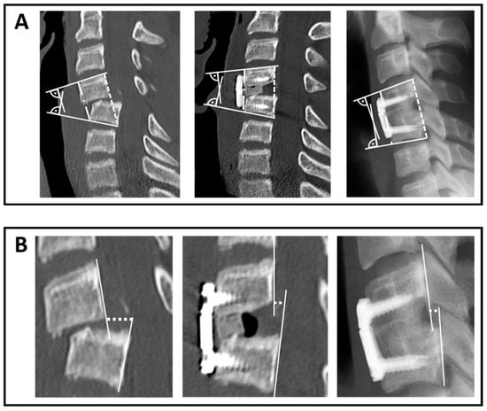 Example CT scan pre- and postoperative and lateral X-ray scan at follow-up. (A) Measurement of the mEA and the ventral and dorsal wall. The mEA (or bEA) was measured between the upper endplate of the superior vertebra and the inferior endplate of the inferior vertebra of the affected segment. The dotted lines indicate the measurement of the ventral and dorsal wall. (B) Measurement of the sagittal translation. The dotted lines mark the measurement of the sagittal translation.