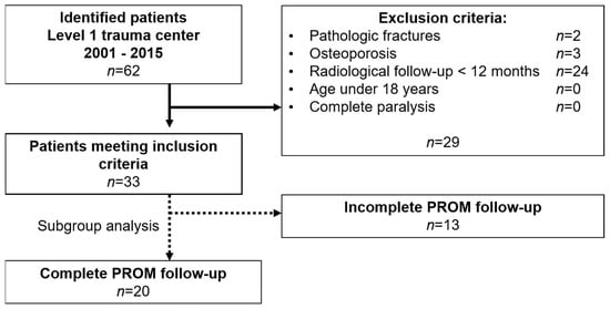 Flowchart of patient enrollment. Sixty-two patients with subaxial cervical fractures were identified between 2001 and 2015. After applying the exclusion criteria, 33 patients were eligible to be included in the study cohort. Twenty patients completed the PROM follow-up, at least 24 months after surgery.