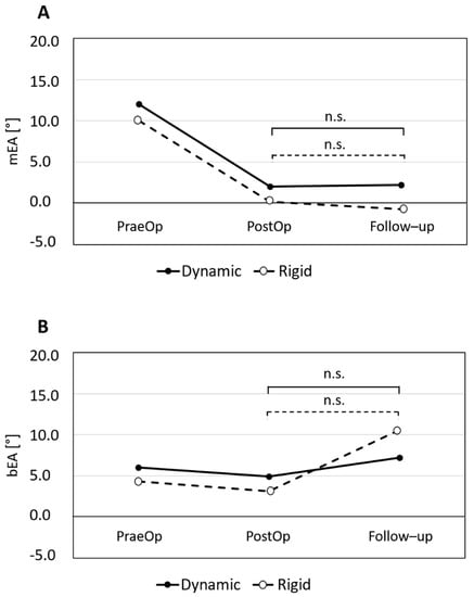 Changes in the mEA (A) and bEA (B) in the dynamic and rigid plate system. There was no significant loss of reduction during the follow up in both groups (A and B).