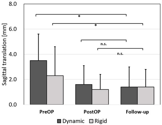 Changes in the sagittal translation. Sagittal translation pre-, postoperative and at the time of the last radiological follow-up. Bars indicate mean values and whiskers the SD. * indicates p < 0.05.