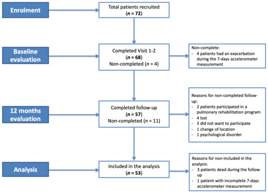 - Garcia-Rio, F.; Rojo, B.; Casitas, R.; Lores, V.; Madero, R.; Romero, D.; Galera, R.; Villasante, C. Prognostic value of the objective measurement of daily physical activity in patients with COPD. Chest 2012, 142, 338–346. [Google Scholar] [CrossRef] [PubMed]