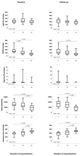Physical activity and sedentary behaviour at baseline and follow-up according to number of exacerbations. The box and whisker plots show the mean ± SD for each physical activity variable and sedentary time by the number of exacerbations (0, 1–2, and ≥3). The left and right figures show the data for baseline and one year, respectively. Abbreviations: min, minutes; MVPA, moderate-to-vigorous physical activity; PA, physical activity.