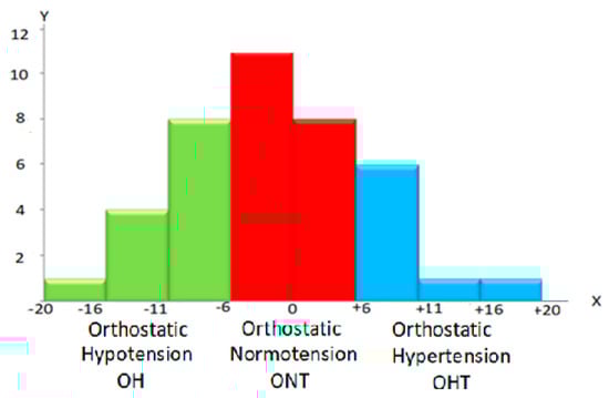 Considering the importance of the ΔSBP for detecting orthostatic disorders of hemodynamics, we carried out a personalized analysis. In this study, we applied known criteria for such impairments from established protocols [19]. A personalized analysis of ΔSBP revealed various deviations (Figure 1).