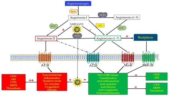 Angiotensin (Ang) 1-7, mainly generated by the angiotensin converting enzyme (ACE)2, until recently a disregarded axis of the renin–angiotensin system (RAS) [3], exerts renal vasodilation and attenuates inflammation, oxidative stress, apoptosis and fibrosis. Although known about for over 20 years, the interest in Ang-(1-7) and its downstream signaling through the G protein-coupled receptor (MasR) has further surged during the Sars-CoV-2 pandemic, since many features of the cytokine storm and coagulopathy characterizing the COVID-19 disease may be linked to the depletion of the ACE2 and Ang-(1-7)-mediated downstream signal in vital organs, along the unleashed Ang II/AT1R axis [4,5]. This review outlines the generation and role of the ACE2/Ang-(1-7)/MasR axis in balancing the devastating actions of the more familiar Ang II-triggered pressor arm of RAS, and delineates the disrupted Ang II/Ang-(1-7) balance that is generated in the COVID-19 disease. We shall discuss the alterations and the well-established renoprotective impact of the ACE2/Ang-(1-7)/MasR axis, attenuating the progression of CKD, and with the same rationale describe preliminary animal studies indicating that the stimulation of the ACE2/Ang-(1-7)/MasR axis may serve as a novel therapeutic option in COVID-19 patients, with special focus on the management of evolving AKI.
