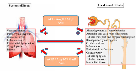 Systemic and direct renal effects of the two arms of RAS leading to acute kidney injury (AKI): the pressor and harmful arm, mediated by the ACE/Ang II/AT1R axis, and the counteracting depressor and protective arm, mediated by the ACE2/Ang-(1-7)/MasR axis and Ang II/AT2R. In addition to a direct impact on the kidney, systemic RAS imbalance, as occurs in COVID-19 disease, can participate in acute renal dysfunction and injury, which may progress to CKD.