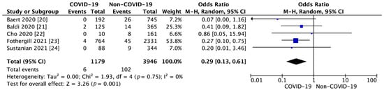 | Parameter | No. of Studies | Cases in COVID-19 Suspected or Diagnosed Group | Cases in COVID-19 Not Suspected or Diagnosed Group | OR (95% CI) | p Value | I2 Statistics |