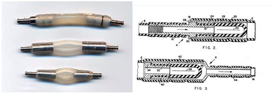 (Left). Reproduced with permission from A. Aschoff. Three different Holter valve designs are shown. The first valve on top is the oldest model (circa 1970), more recent designs in the middle and on the bottom. This valve was discontinued and no longer available. (Right). Reproduced from Figure 2 and Figure 3 of the patent filed 2 October 1956 by Holter and Spitz []. Both figures are enlarged sections showing the inlet (FIG. 2) and outlet valves (FIG. 3) of the device. Labels 22 and 38 show the inlet and outlet tubes with lateral slits “three-sixteenth inch in length” (0.80 cm), which functions as the actual valve.
