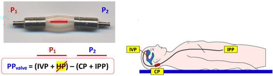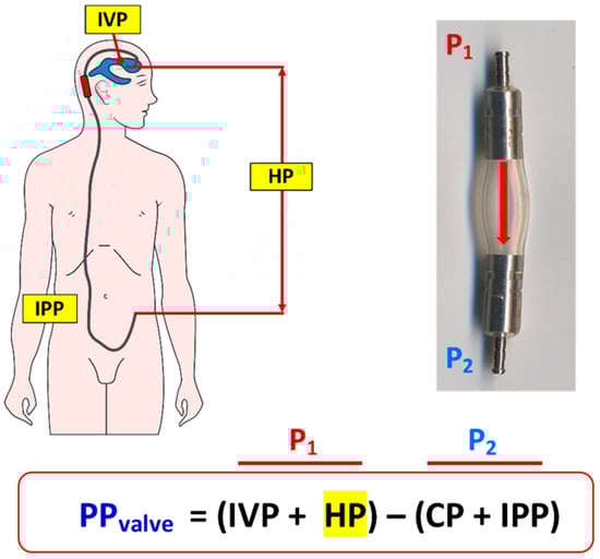 As shown in Figure 2, IVP and the HP within the shunt contribute to P1, while the sum of the CP of the DPV valve and the intracavitary pressure where the distal catheter is placed contribute to P2. For the sake of simplicity, we consider that the cavity in which CSF is shunted is the peritoneal cavity and therefore the intraperitoneal pressure (IPP) is the outlet pressure. An important concept to grasp is that in any DPV, the valve will be always closed when PPshunt is ≤0, and it will open when PPshunt is >0. Once the valve is opened, the CSF flow through the shunt will be regulated by Equation (2).
