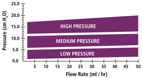 Figure reproduced with permission from the Natus Neurosurgery and Neurocritical CareProduct and Accessory Catalog, 2019 (https://natus.com, accessed on 23 June 2020). In this graph, the flow–pressure data for the Contour-Flex™ family of valves are shown. Contour-Flex™ are typical silicone diaphragm valves with a low–medium- and high-pressure ranges. Flow rates in the x-axis represent a variable flow rate from 1 to 50 mL/h while in the y-axis the pressure generated at each flow rate is shown. Colored bands define the variability of the pressures obtained for each flow rate.