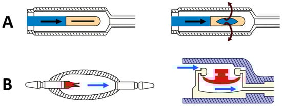 (A). Schematic drawing of a silicone slit valve. Slit valves are essentially silicon tubes that are closed at the end and have slits in their sides. On the left, a closed tube with a lateral slit is shown. On the right, the slit opens and allows CSF flow when the pressure inside the tube exceeds the predefined OP setting defined by the manufacturer. Arrows indicate the direction of CSF flow. (B). On the left, an opener miter valve is shown. The two silicon leaflets open when CSF inside the shunt exceeds the predefined OP. (B). On the right, a drawing of a diaphragm valve is shown. When CSF in the circuit exceeds the OP of the valve, the diaphragm moves down and allows the fluid to pass through. Arrows indicate the direction of the flow.