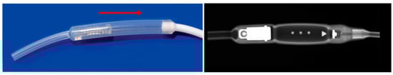 (Left). The ChabbraTM “slit n’ spring” valve (Surgiwear Limited, Shahjahanpur, India) is a design based in the slit valve. In this case, the silicone tube within the flushing reservoir in which the slit seat is protected by a stainless-steel spring. The red arrow indicates the direction of the flow. (Right). Radiograph of a Codman–HakimTM Precision low-medium DPV (Integra LifeSciences Corporation). This DPV is a conventional mechanical spring-loaded ball-in-cone valve. The three dots indicate the OP of the valve and the short arrowhead the direction of the flow.