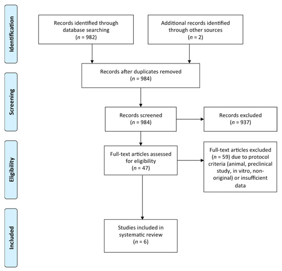 A total of 982 manuscripts were identified from the literature. After screening the title and abstracts, we identified 47 potential records. After screening, a total of six [25,28,29,30,31,32] clinical trials met the selection criteria and were included in this systematic review (Figure 1).