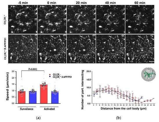 Time-lapse recordings of the same cortical region before and after a micro lesion was done with a laser shows how microglia will rapidly isolate the lesion site from the healthy brain, as to stop the spread of the damage. (a) In the presence of amyloid microglia are slower to react to the lesion although the surveillance speed in the intact parenchyma is comparable between tissue with and without amyloid; (b) Analyzing microglia morphology using a Scholl approach has revealed no difference in the number of intersections from the cell body but revealed that in the presence of amyloid, microglia appear to have a shorter process arborization. Data collected from 4 animals only expressing CX3CR1 (29 analyzes cells) and from 3 animals expressing both CX3CR1 and APP/PS1 mutations (26 analyzed cells). Mean and standard deviation is shown. APP: amyloid precursor proteins; PS1: presenilin 1.